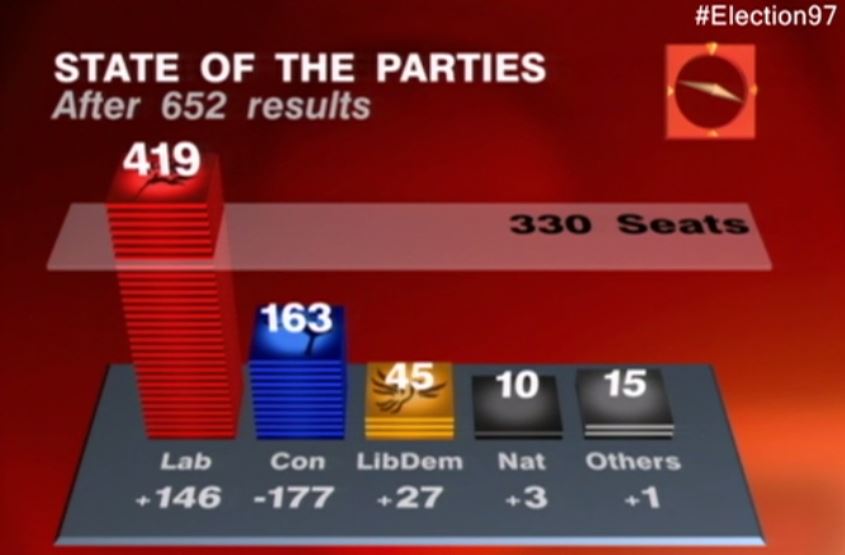 In the end, a landslide majority of 179 proved the coalition was a success. Labour won 43.2% of the national vote with 418 seats. It was made possible because of Blair’s inclusive coalition. The huge unpopularity of the Conservatives enormously helped. John Major obtained 30.7% for his party, their worst showing since 1832. However, the distance between a winning Labour Party and the Tories was the largest ever recorded in a general election at a large 12.5%.